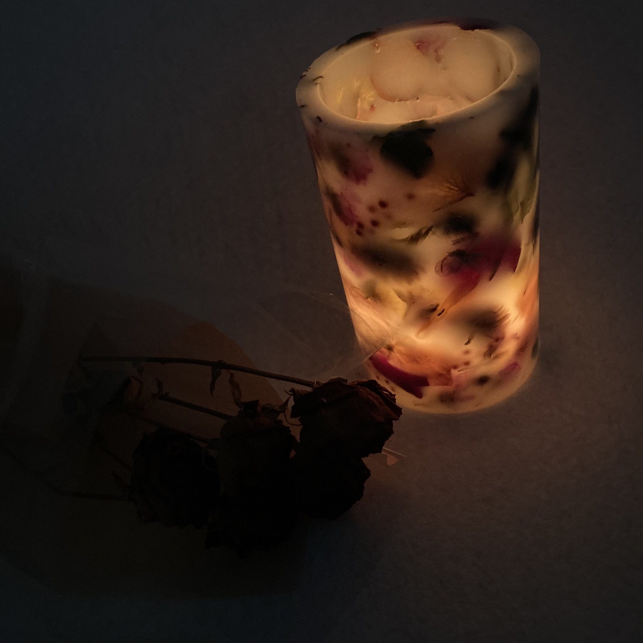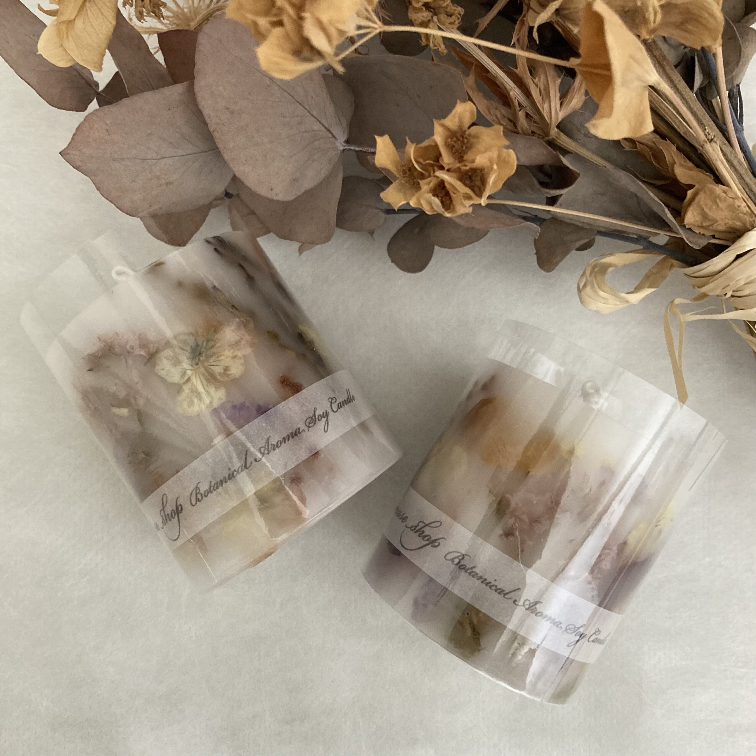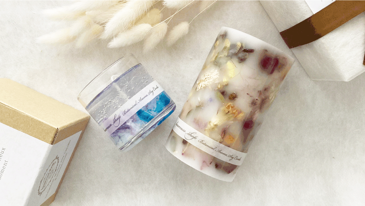 ドライフラワーやハーブなどの天然の植物素材をワックスに閉じ込めたキャンドルです。出来上がると艶のある半透明な美しい装いになり、中の植物が透けて見えることで視覚的な美しさと香りなどの癒しを同時に楽しむことができます。