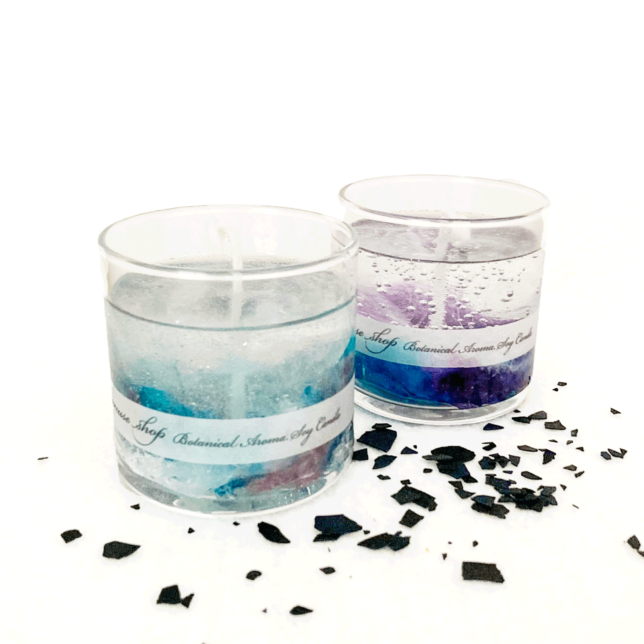 固まっても白くなることがなく、ぷにぷにとした透明なジェル状のワックスを使用して作られた涼しげな印象のキャンドルです。水のように澄んだ見た目で、光を透過するため光が柔らかく周囲に広がり、幻想的で優しい雰囲気を演出します。とろみのあるジェルが芯にゆっくり吸い上げられるため、燃焼時間が長く実用性も高いです。